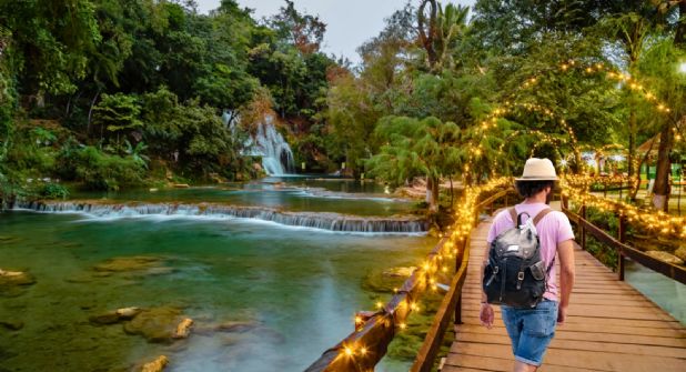 Se trata de las Cascadas de Tamasopo, un balneario natural que se conforma de tres caídas de agua que desembocan y dan vida al río de Tamasopo. Este lugar puedes pasar un día lleno de alegría, dinamismo y hasta adrenalina. Aquí, puedes disfrutar de distintas actividades, sin embargo, la más atractiva es cruzar un puente iluminado para llegar hasta las hermosas cascadas.