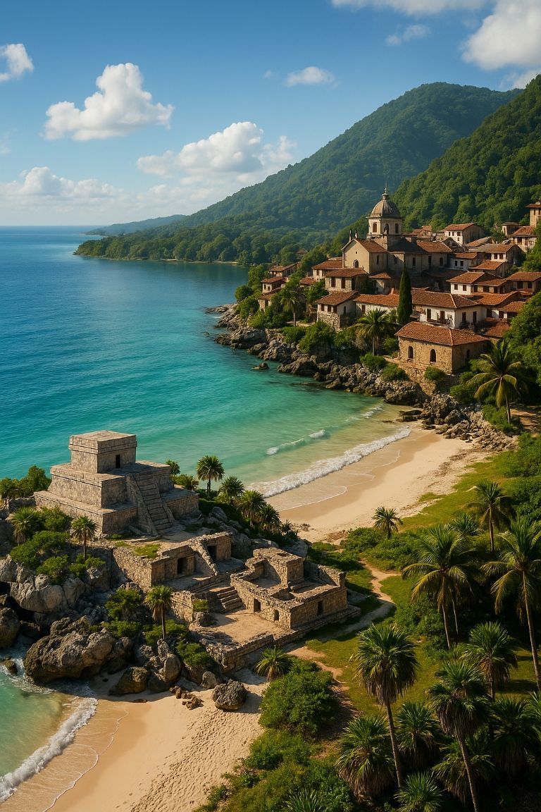 Según la IA, este lugar híbrido desplegaría una costa caribeña con aguas turquesa y arrecifes de coral, justo al lado de un lago cristalino rodeado de pinos y encinos. Imagina amanecer practicando yoga frente a las ruinas mayas sobre la arena y, en cuestión de minutos, trasladarte en kayak por un lago montañoso bajo la neblina matinal.